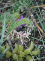 Description: This member of the pea family is easily recognized by its seed pod looking like a close relative of fresh green peas in a pod. The flowers also resemble domestic sweet peas as do the leaves. Look for clusters of purple flowers in May and early June close to the ground. The compound leaves have 15 to 19 narrow leaflets and several leaves per prostrate stem. There are five species of milkvetches found at Chimney Rock.
