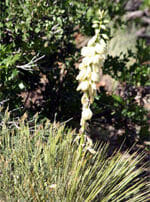 Description: The Banana Yucca was likely the single most important wild plant to the Ancestral Puebloans. This family of plants has multiple leaves extending from a ground-level central stem. The sharp tip on the leaves is its only armor and gives rise to Banana Yucca’s nicknames, Spanish Bayonet or Spanish Dagger. Even Great Plains or Narrow Leaf yucca is sometimes called Spanish Needles. The leaf rosette may reach 2 feet tall but the flower stalks can extend to 5 feet in height with many yellow-green to creamy white, lily-like flowers appearing June to July. By mid summer, those flowers have turned to large, fleshy green fruits on the banana yucca. Flowers can be creamy to yellow green and are bell-shaped. Both types yield large black seeds. Banana yucca leaves can be up to 3 inches wide; narrow leaf yucca leaves are up to 1 inch wide. Leaves are evergreen but the shedding that occurs along the outer margins of the leaves gives them a gray to white appearance.